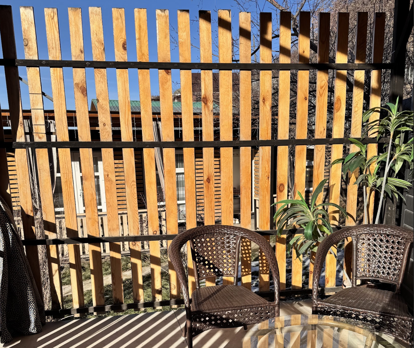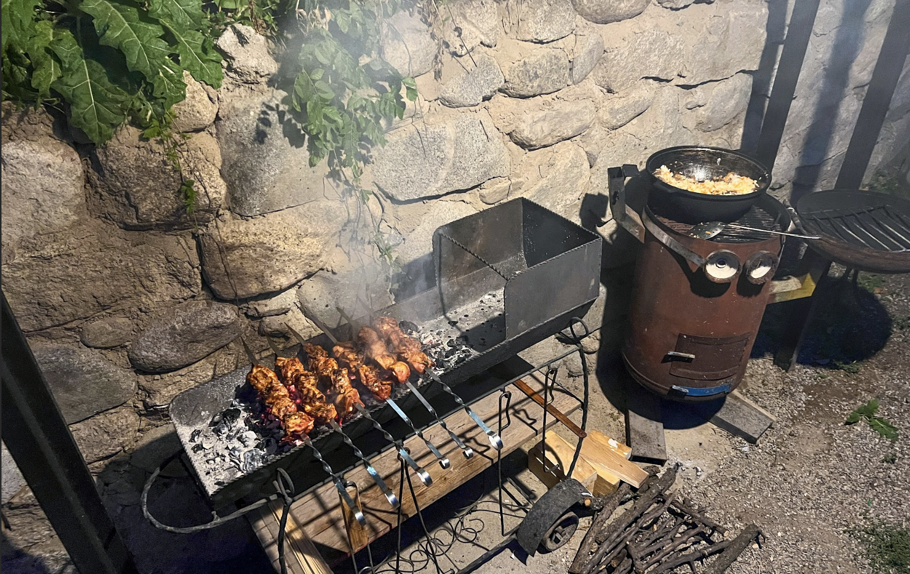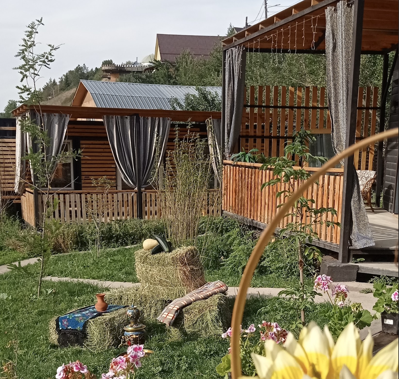 Рядом с домиками есть барбекю-зона: Мангал, шампуры, решетки и терраса. Также вы можете приобрести мешок с углём для мангала